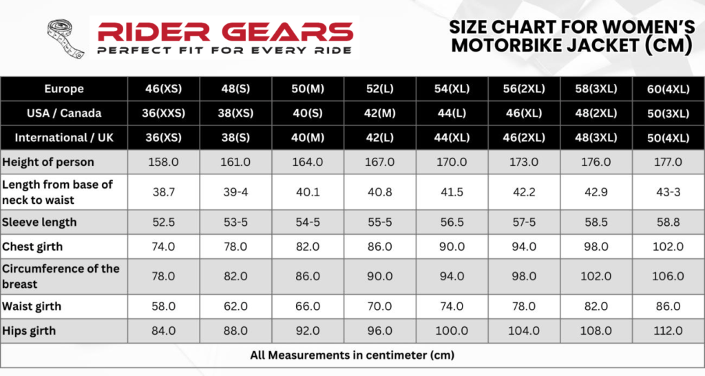 WOMENS MOTORBIKE JACKET SIZE CHART