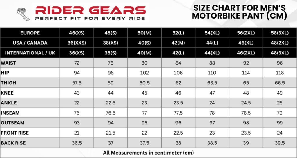 MENS MOTORBIKE PANT SIZE CHART