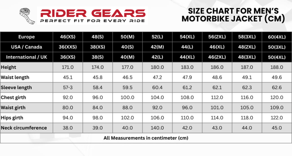 MENS MOTORBIKE JACKET SIZE CHART