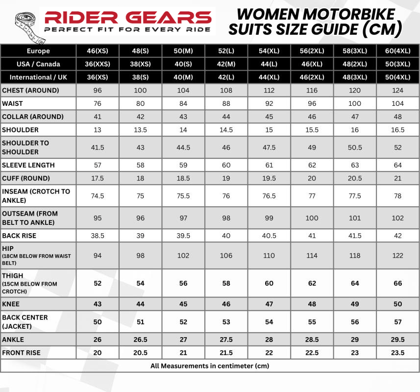 WOMENS MOTORBIKE SUIT SIZE CHART