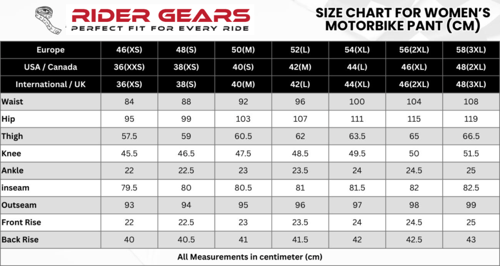 WOMENS MOTORBIKE PANT SIZE CHART